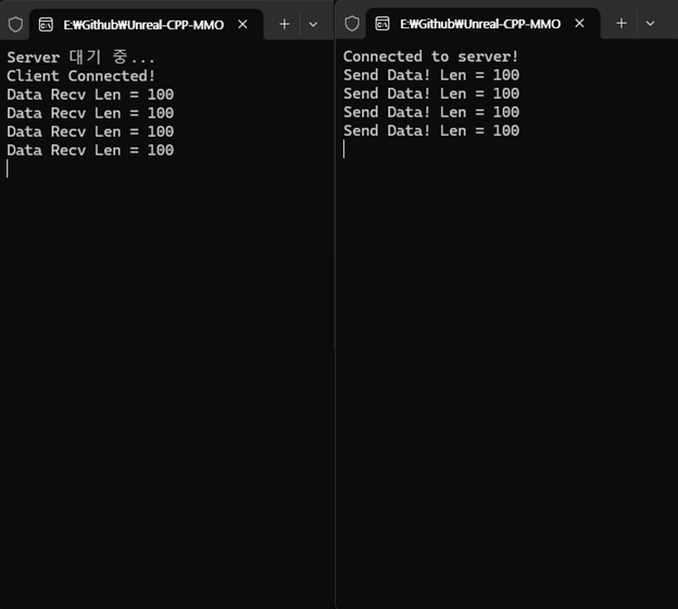 이전까지는 에코 서버 방식으로 테스트했지만, 이번에는 클라이언트는 Send만 하고 서버에서는 Recv만 하도록 간단하게 해 본다.