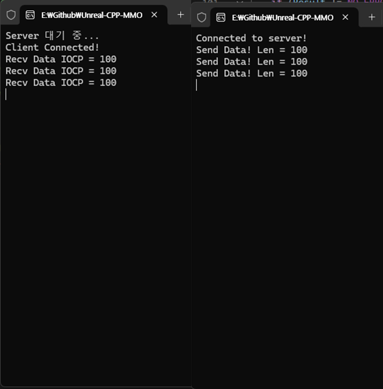 현재는 다시 입출력 함수를 호출할 때, CompletionStatus를 Get 할 때 사용했던 Overlapped(FIoInfo)를 다시 그대로 넘겨주도록 했다. 만약 Recv가 아니라 Send와 같은 다른 입출력을 처리하고 싶다면 새로운 객체를 동적할당하여 타입을 설정한 뒤 넘겨주고 기존 객체는 해제해 주면 된다.