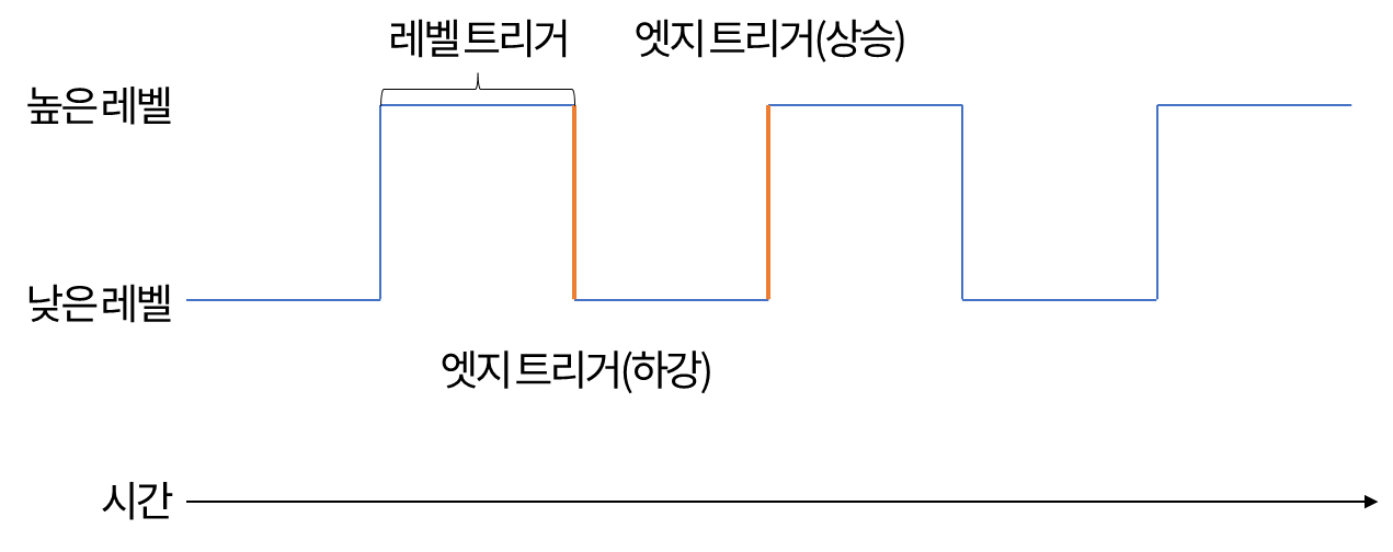 전자공학에서 유래한 용어로, level은 "신호 상태 유지", edge는 "신호 변화 감지"에 해당한다.